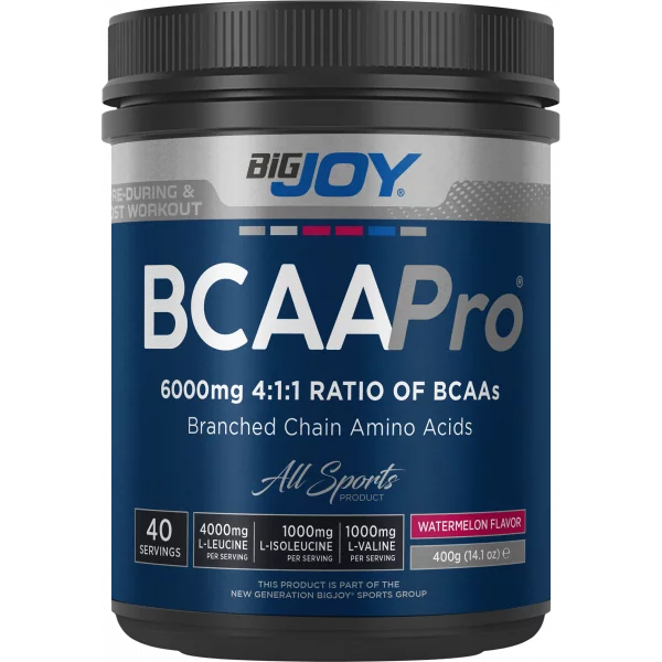 BIGJOY® BCAAPro toz formunda bir BCAA ürünüdür. Üstün Alman teknolojisi ile üretilmiştir. Her servisinde 6000 mg BCAA sunar. 4:1:1 BCAA oranına sahiptir ve 4000 mg lösin amino asidi içerir.