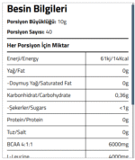 Bileşenler; 1 servis (10g) için; 4:1:1 BCAA ( L-Lösin, L-Valin, L-İzolösin) 6000mg, Karpuz Aroma Vericisi, Asitlik Düzenleyici( Malik Asit), Dekstrin, Tatlandırıcılar ( Sukraloz, Asesülfam K ), Renklendirici ( Pancar Kökü Kırmızısı), Topaklanmayı Önceleyici ( Silikon Dioksit).