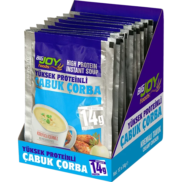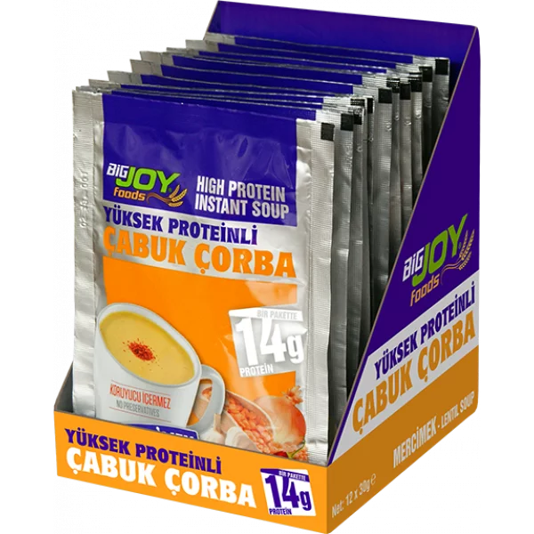 Fazla kalori almadan, pratik ve besleyici öğünler tüketmek istiyorsanız BIGJOY® proteinli çorba tam size göredir. Bir pakette 14 gram protein içerir ve her paket 100 kcal’nin altındadır. MSG yani monosodyum glutamat, koruyucu ya da renklendirici madde içermez.